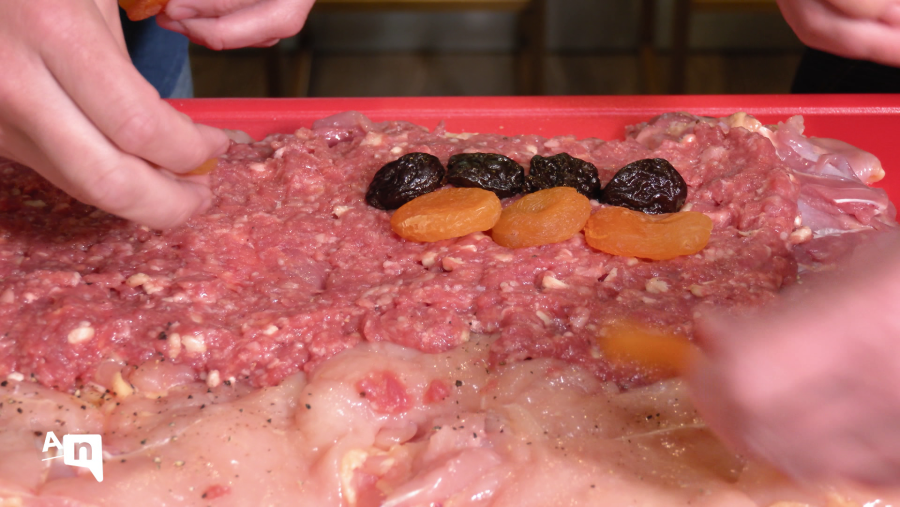 Abrir la pularda deshuesada, poner el relleno por encima, hacer una línea con las ciruelas y los orejones e ir enrollándolo todo RTVE