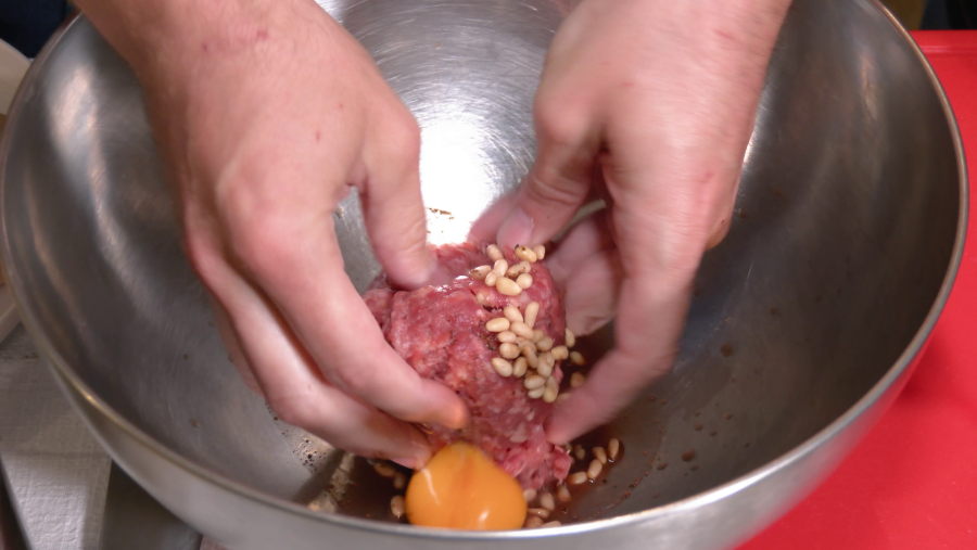 Echar la carne picada en un bol, añadir los piñones, sal y pimienta al gusto, el vino de Oporto y el huevo. Se mezcla todo bien RTVE