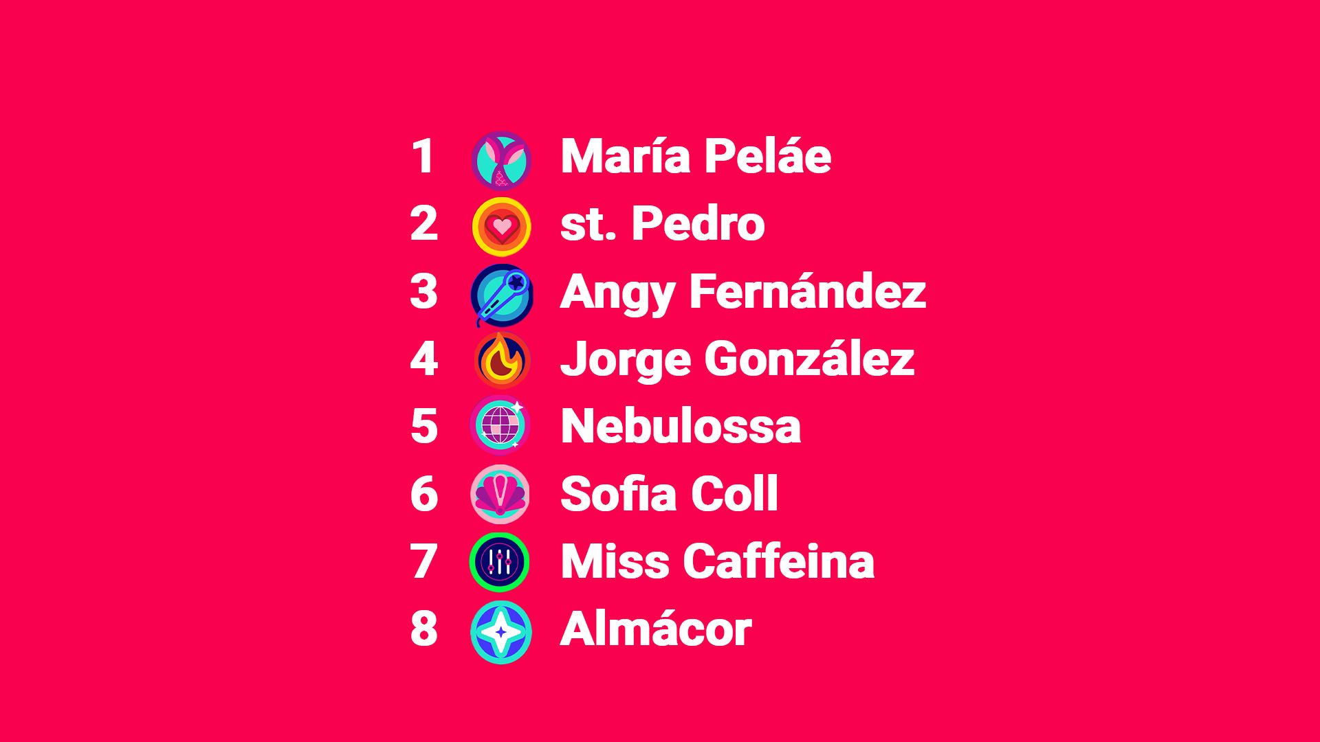 Nebulossa, Angy Fernádez, Sofia Coll, Miss Caffeina, St. Pedro, María Peláe, Jorge González y Almácor ya están dentro de la gran final de este sábado 3 de febrero. Blanca Paloma ha sido la escogida como la mano inocente para sacar los sobres que desvelan el orden en el que actuarán el sábado los finalistas.