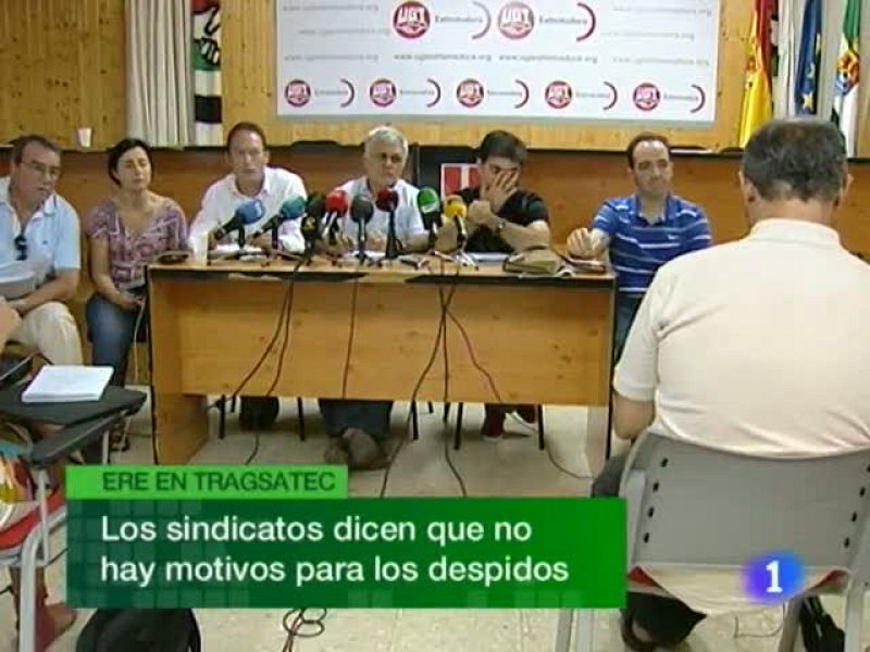 La Junta asegura que no es su competencia evitar el Ere en la empresa Tragsatec, que puede afectar a más de 300 trabajadores a partir de septiembre. Eso sí, Junta y empresa garantizan la campaña de saneamiento ganadero hasta final de año. El ejecutivo autonómico echa las culpas a la gestión del anterior gobierno. El Psoe se defiende en un comunicado e insta a la Junta a que tome decisiones. Dicen los socialistas que el gobierno sí puede evitar este ERE al tratarse de una empresa pública...El Tribunal de Cuentas denuncia numerosas incidencias en la actividad de Patronatos o Fundaciones, como la Academia Europea de Yuste o la Fundación Helga de Alvear...En el caso del Festival de Teatro de Mérida, apunta irregularidades en los años 2006 y 2007...El aeropuerto de Badajoz será uno de los espacios aéreos que sufrirá los próximos 18 y 26 de agosto los paros del personal de tierra que han convocado Comisiones Obreras, UGT y Uso. (09/08/11)