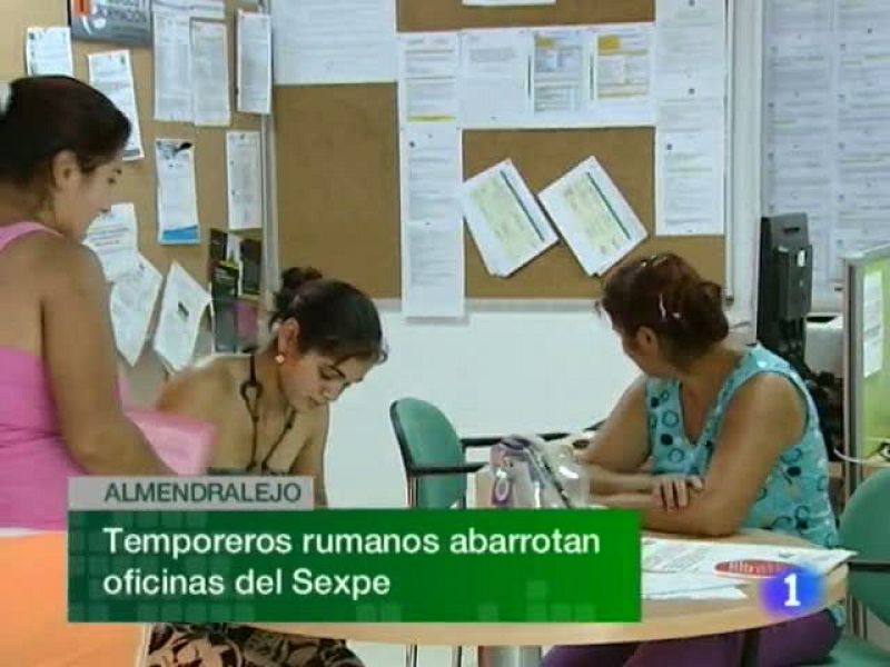 Decenas de rumanos se acercaban esta mañana a las oficinas del Sexpe en Almendralejo para saber cuáles son los nuevos requisitos impuestos para trabajar en la vendimia. La medida les ha cogido por sorpresa...Se mantiene la concentración de trabajadores del grupo financiero Liberbank para el próximo sábado en Gijón...Hoy las 60 diócesis de toda España reúnen a jóvenes peregrinos para impulsar actividades previas a la llegada del Pápa a Madrid el próximo jueves. En Fuente del Maestre, por ejemplo, jóvenes de lugares como Taiwán o Zimbawe restauran un convento franciscano y preparan números musicales para la eucaristía que tendrá lugar esta tarde...Esta noche se estrenará La Antígona de Sófocles, en su versión más clásica. Pide paso con una puesta en escena poderosa sustentada en dos coros con mucho protagonismo. La actriz Marta Etura encarna comparte tablas con Blanca Portillo y los actores extremeños Antonio Gil y Alberto Amarilla. (11/08/11)