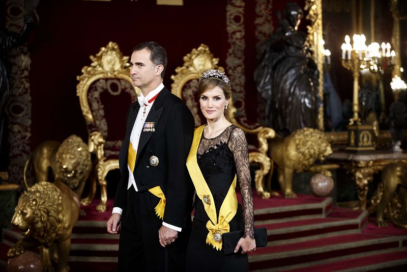 Don Juan Carlos ejerce por última vez como anfitrión de un dirigente extranjero con motivo de la visita de Estado del presidente de México, Enrique Peña Nieto, que viaja acompañado de su esposa, Angelica Rivero, y varios de sus ministros. Con este motivo, los Reyes y los Príncipes ofrecieron una cena de gala en el Palacio Real con 125 invitados. Un acto en el que el rey ha cedido el testigo a su hijo como primer embajador de España en el brindis inicial de la cena.
